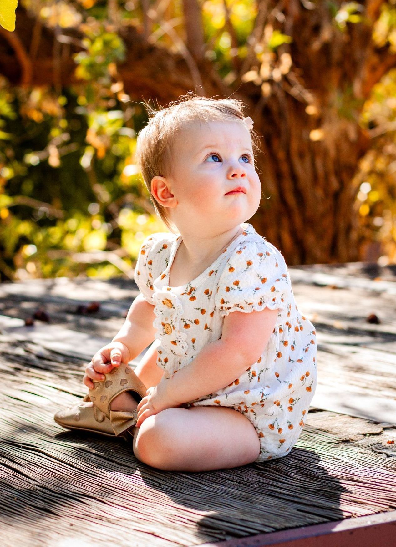ButtonBaby Zoey looks up at her mom wondering why she is posing for a random girl with a camera.