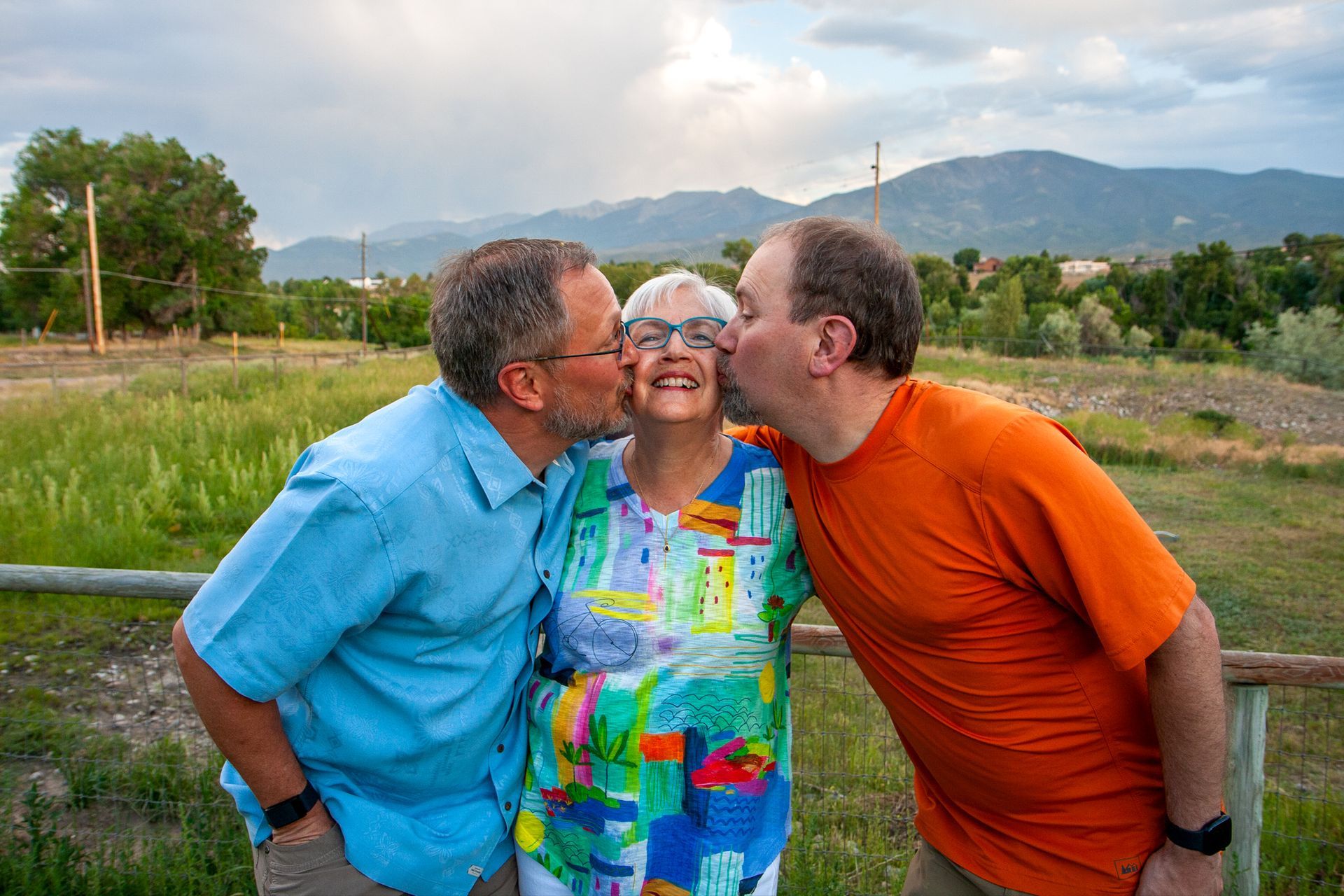 Brothers Shawn and Ryan kiss their beaming mother on each cheek.