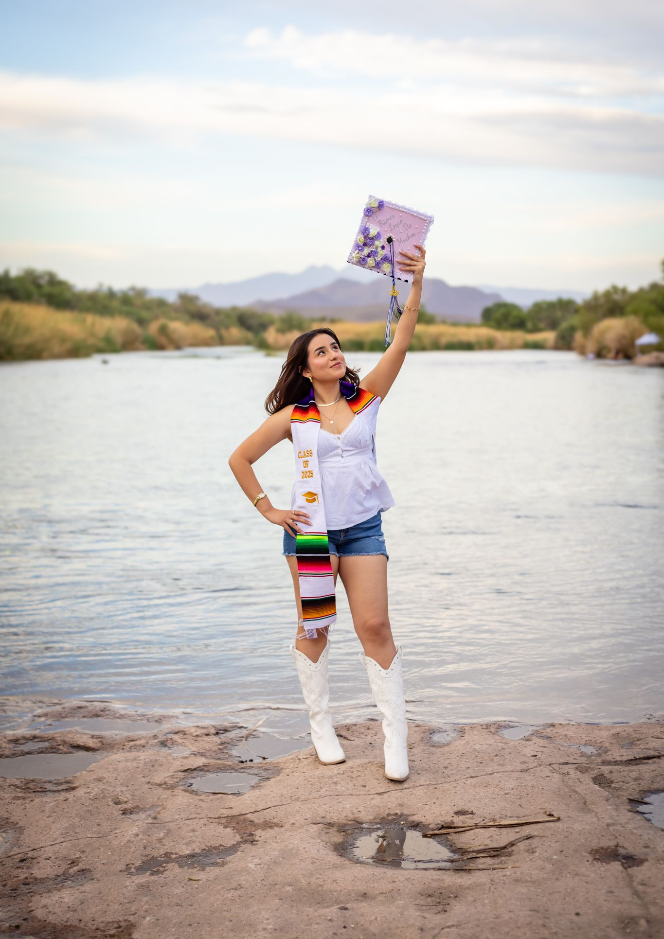 ButtonAurora takes in the scent and the view of the beautiful Lake Pleasant sunset during her senior photo session.
